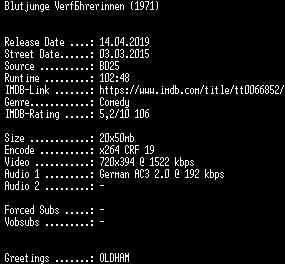 | FiLENAME: | Blutjunge.Verfuehrerinnen.German.1971.AC3.BDRiP.x264.iNTERNAL-SPiCY.mkv |