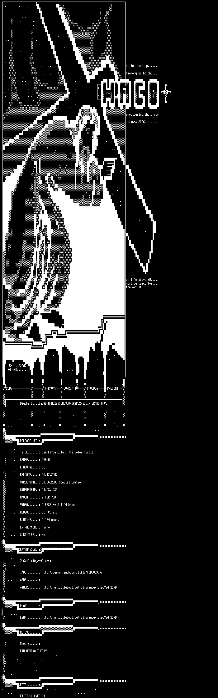 | FiLENAME: | Die.Farbe.Lila.GERMAN.1985.AC3.DVDRiP.XviD.iNTERNAL-HACO.CD2.avi |