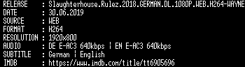 | FiLENAME: | Slaughterhouse.Rulez.2018.GERMAN.DL.1080P.WEB.H264-WAYNE.mkv |