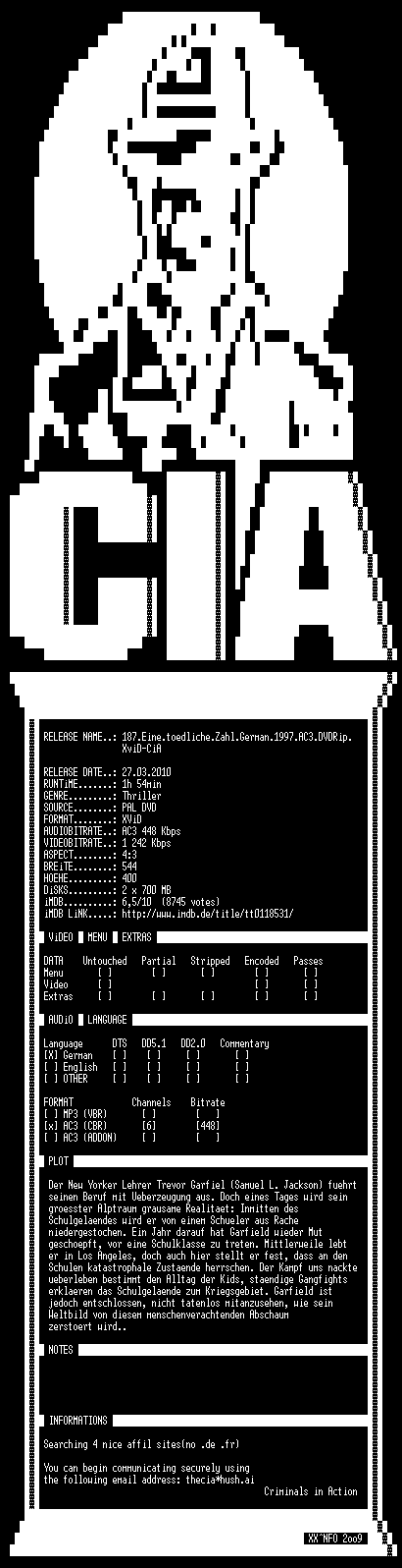 | FiLENAME: | 187.Eine.toedliche.Zahl.German.1997.AC3.DVDRip.XviD-CiA.CD1.avi |