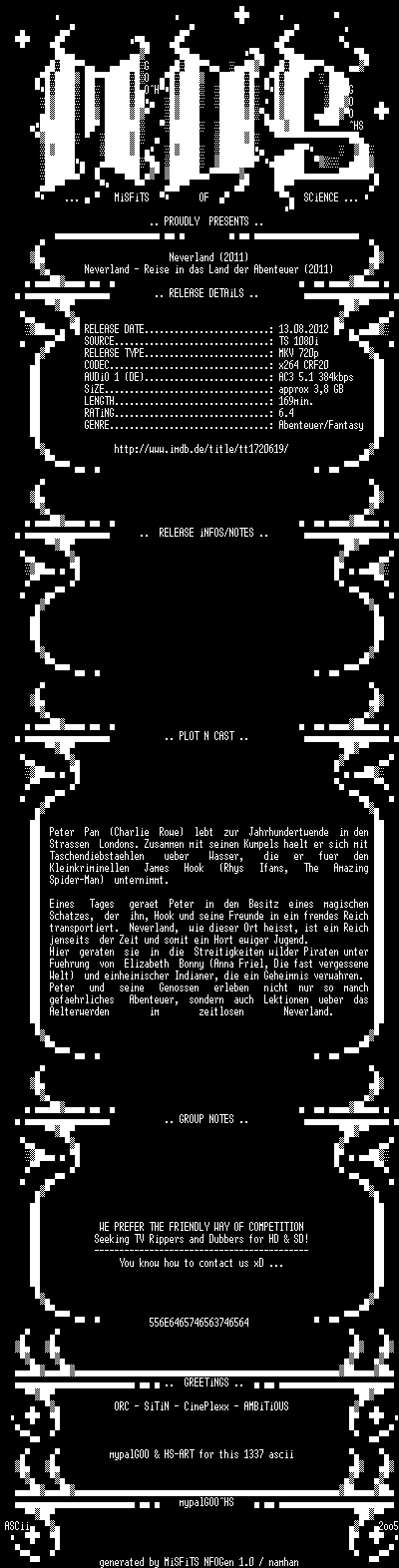 | FiLENAME: | Neverland.-.Reise.in.das.Land.der.Abenteuer.2011.GERMAN.WS.720p.HDTV.x264-MiSFiTS.mkv |