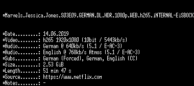 | FiLENAME: | Marvels.Jessica.Jones.S03E09.GERMAN.DL.HDR.1080p.WEB.h265.iNTERNAL-EiSBOCK.mkv |