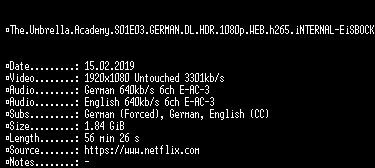 | FiLENAME: | The.Umbrella.Academy.S01E03.GERMAN.DL.HDR.1080p.WEB.h265.iNTERNAL-EiSBOCK.mkv |