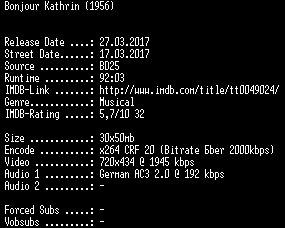 | FiLENAME: | Bonjour.Kathrin.German.REMASTERED.1956.AC3.BDRip.x264-SPiCY.mkv |