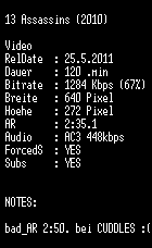| FiLENAME: | 13.Assassins.German.2010.AC3.DVDRip.XviD.PROPER-FiLMSTARS.CD2.avi |