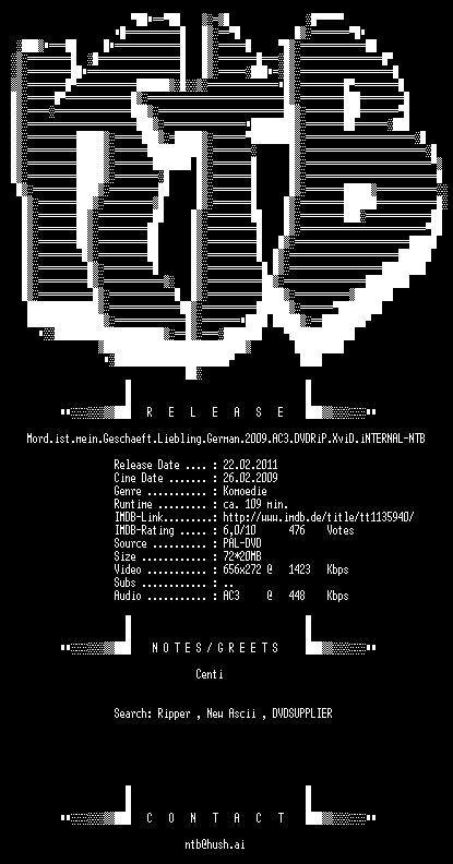 | FiLENAME: | Mord.ist.mein.Geschaeft.Liebling.German.2009.AC3.DVDRiP.XviD.iNTERNAL-NTB.avi |