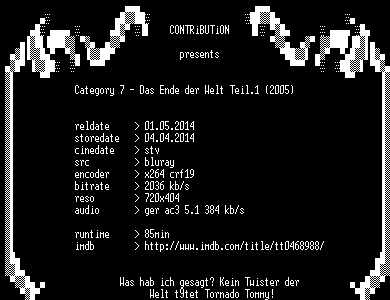 | FiLENAME: | Category.7.Das.Ende.der.Welt.Teil.1.2005.German.BDRip.x264-CONTRiBUTiON.mkv |