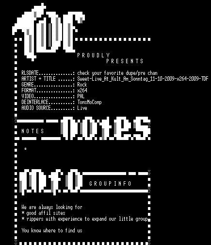| FiLENAME: | Sweet-Live_At_Kult_Am_Sonntag_11-10-2009-x264-2009-TDF.rar |