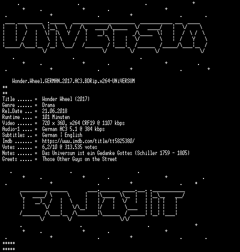 | FiLENAME: | Wonder.Wheel.GERMAN.2017.AC3.BDRip.x264-UNiVERSUM.mkv |