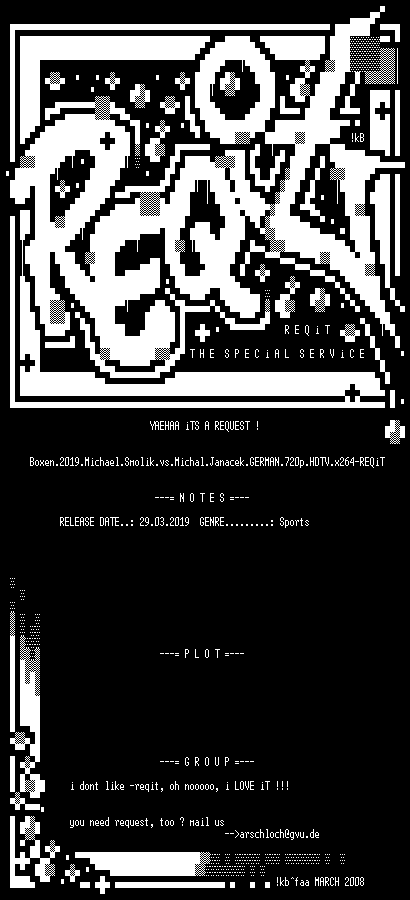 | FiLENAME: | Boxen.2019.Michael.Smolik.vs.Michal.Janacek.GERMAN.720p.HDTV.x264-REQiT.mkv |