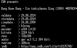 | FiLENAME: | Bang.Boom.Bang.Ein.todsicheres.Ding.1999.German.BDRip.x264.iNTERNAL.REPACK-CWA.mkv |