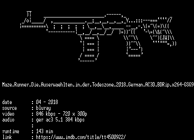 | FiLENAME: | Maze.Runner.Die.Auserwaehlten.in.der.Todeszone.2018.German.AC3D.BDRip.x264-GSG9.mkv |