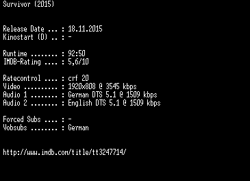| FiLENAME: | Survivor.2015.German.DTS.DL.1080p.BluRay.x264-EXQUiSiTE.mkv |