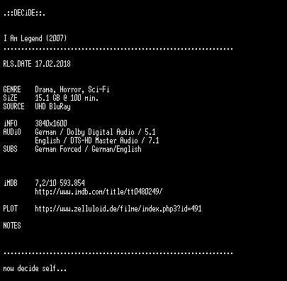 | FiLENAME: | I.Am.Legend.2007.GERMAN.DL.2160p.UHD.BluRay.x265-DECiDE.mkv |