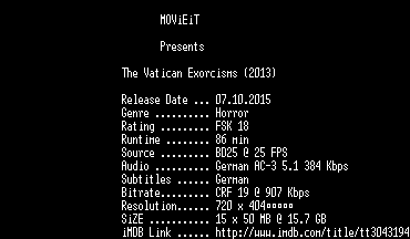 | FiLENAME: | The.Vatican.Exorcisms.German.2013.AC3.BDRip.x264-MOViEiT.mkv |