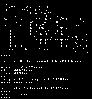 | FiLENAME: | My.Little.Pony.Freundschaft.ist.Magie.S03E01.German.DL.720p.WEBHD.x264-JuniorTV.mkv |