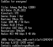| FiLENAME: | Johnny.Mad.Dog.German.SUBBED.2008.AC3.DVDRip.XviD-CUDDLES.avi |