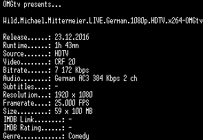| FiLENAME: | Wild.Michael.Mittermeier.LIVE.German.1080p.HDTV.x264-OMGtv.mkv |