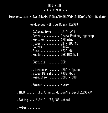 | FiLENAME: | Rendezvous mit Joe Black (1998) [GER-dts 720p BD].mkv |
