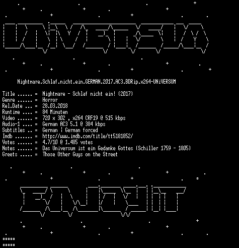| FiLENAME: | Nightmare.Schlaf.nicht.ein.GERMAN.2017.AC3.BDRip.x264-UNiVERSUM.mkv |