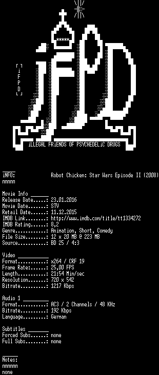 | FiLENAME: | Robot.Chicken.Star.Wars.Episode.II.German.2008.AC3.BDRiP.x264-iFPD.mkv |