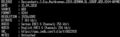 | FiLENAME: | Descendants.3.Die.Nachkommen.2019.GERMAN.DL.1080P.WEB.X264-WAYNE.mkv |