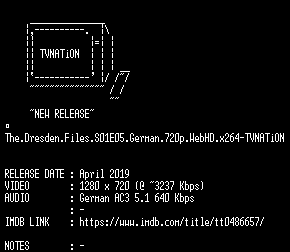 | FiLENAME: | The.Dresden.Files.S01E05.German.720p.WebHD.x264-TVNATiON.mkv |