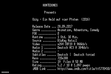 | FiLENAME: | Ozzy.Ein.Held.auf.vier.Pfoten.German.2016.AC3.BDRip.x264-HUNTEDONES.mkv |