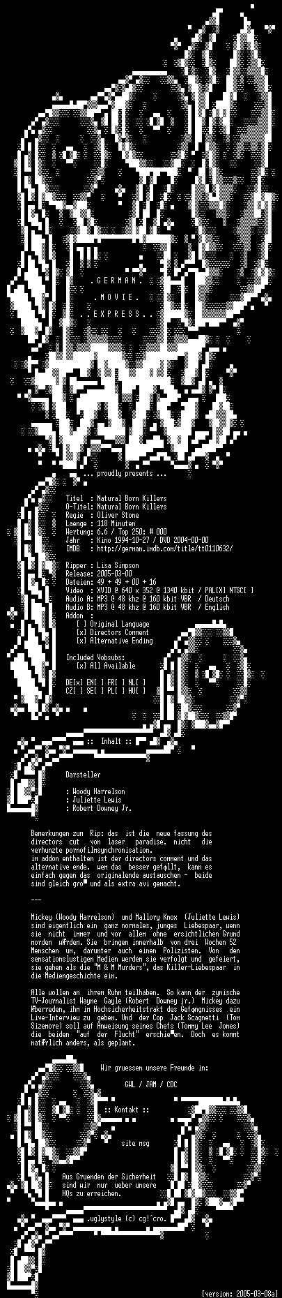 | FiLENAME: | Natural.Born.Killers.1994.DC.Neue.Fassung.GERMAN.DLXViD.DVDRIP-GME2000.CD1.avi |