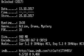 | FiLENAME: | Unlocked.German.2017.DL.BDRip.x264-CiNEViSiON.mkv |