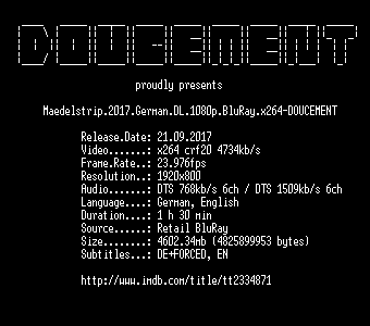 | FiLENAME: | Maedelstrip.2017.German.DL.1080p.BluRay.x264-DOUCEMENT.mkv |