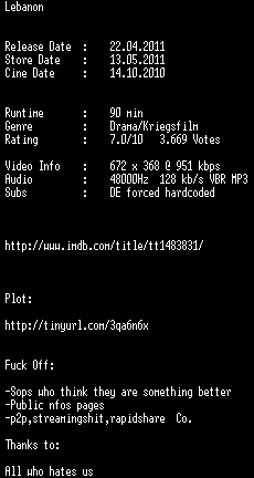 | FiLENAME: | Lebanon.German.DVDRip.XviD-DiSTRiCT.avi |