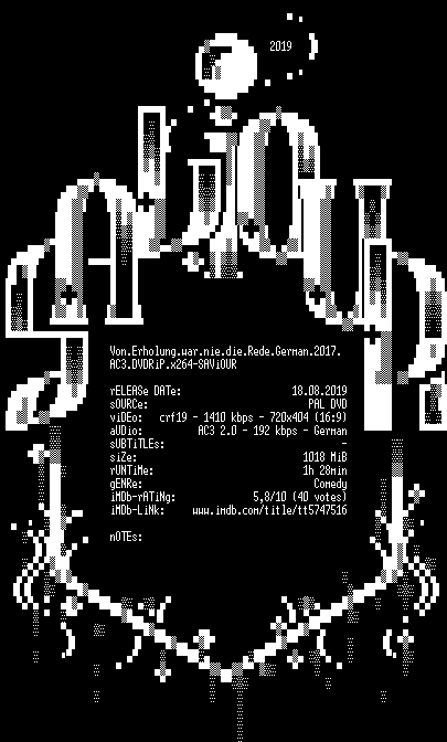 | FiLENAME: | Von.Erholung.war.nie.die.Rede.German.2017.AC3.DVDRiP.x264-SAViOUR.mkv |