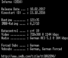 | FiLENAME: | Inferno.German.2016.AC3.BDRip.x264-COiNCiDENCE.mkv |