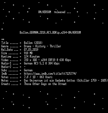 | FiLENAME: | Ballon.GERMAN.2018.AC3.BDRip.x264-UNiVERSUM.mkv |