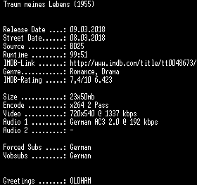 | FiLENAME: | Traum.meines.Lebens.German.REMASTERED.1955.AC3.BDRip.x264-SPiCY.mkv |