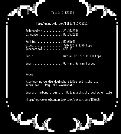 | FiLENAME: | Triple.9.German.2016.AC3.BDRip.x264.iNTERNAL-iNCOMiNG.mkv |