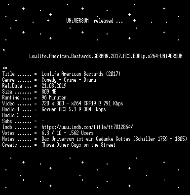 | FiLENAME: | Lowlife.American.Bastards.GERMAN.2017.AC3.BDRip.x264-UNiVERSUM.mkv |