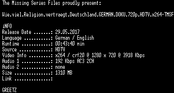 | FiLENAME: | Wie.viel.Religion.vertraegt.Deutschland.GERMAN.DOKU.720p.HDTV.x264-TMSF.mkv |