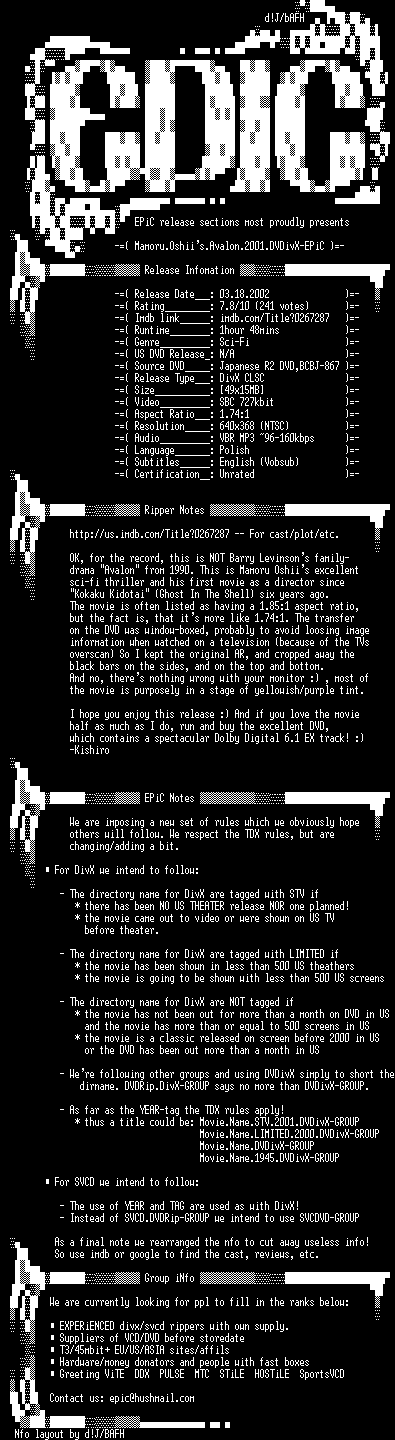 | FiLENAME: | Mamoru.Oshiis.Avalon.2001.DVDivX-EPiC.avi |