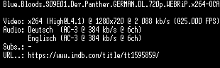 | FiLENAME: | Blue.Bloods.S09E01.Der.Panther.GERMAN.DL.720p.WEBRiP.x264-OCA.mkv |
