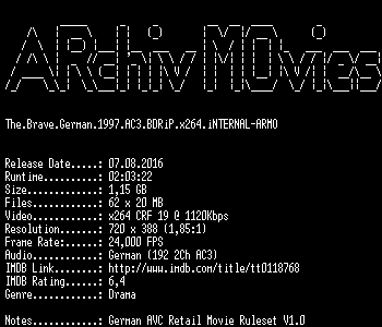 | FiLENAME: | The.Brave.German.1997.AC3.BDRiP.x264.iNTERNAL-ARMO.mkv |