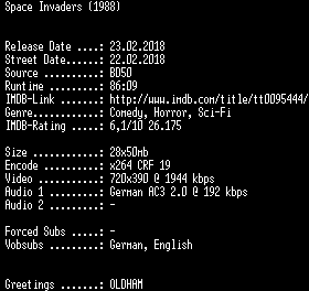 | FiLENAME: | Space.Invaders.German.REMASTERED.1988.AC3.BDRip.x264-SPiCY.mkv |