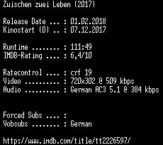 | FiLENAME: | Zwischen.zwei.Leben.German.2017.AC3.BDRip.x264-COiNCiDENCE.mkv |