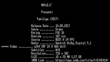 | FiLENAME: | Familiye.German.2017.BDRiP.x264-MOViEiT.mkv |