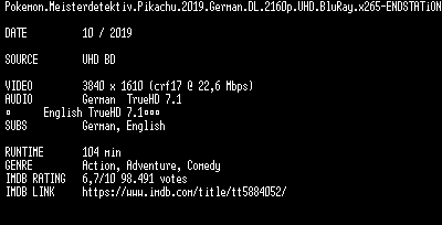 | FiLENAME: | Pokemon.Meisterdetektiv.Pikachu.2019.German.DL.2160p.UHD.BluRay.x265-ENDSTATiON.mkv |