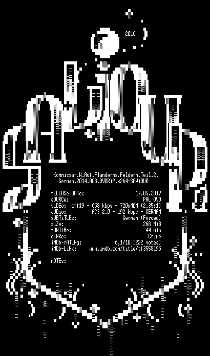 | FiLENAME: | Kommissar.W.Auf.Flanderns.Feldern.Teil.2.German.2014.AC3.DVDRiP.x264-SAViOUR.mkv |