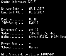 | FiLENAME: | Casino.Undercover.German.2017.AC3.BDRip.x264-COiNCiDENCE.mkv |