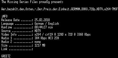 | FiLENAME: | Wer.bezahlt.den.Osten.-.Der.Preis.der.Einheit.GERMAN.DOKU.720p.HDTV.x264-TMSF.mkv |