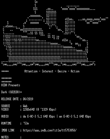 | FiLENAME: | Dark.S02E08.German.DL.720p.WebHD.x264-AIDA.mkv |